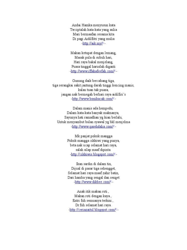 Balik kampung Jumpa atok Itu Perbuatan Manusia terkutuk. Pada setiap kali sambutan hari raya Aidilfitri ramai dalam kalangan kita mengambil kesempatan mengucapkan pantun dan ucapan raya sebagai pengganti diri. You rhymed bergema bersama dendang rendang all internally within the lines.